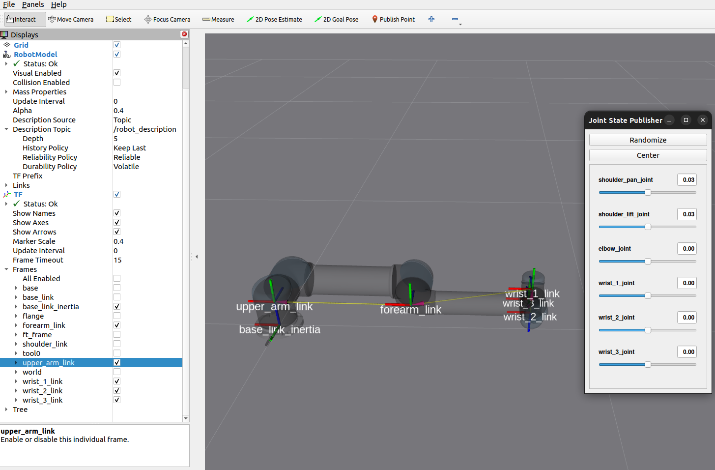 In RVIZ, open the configuration file in the folder config to get a better view of the UR5 and its frames: